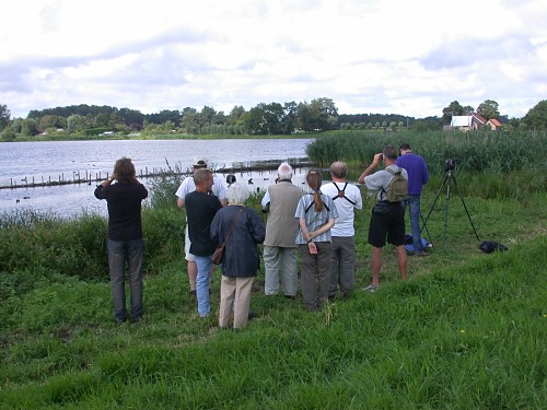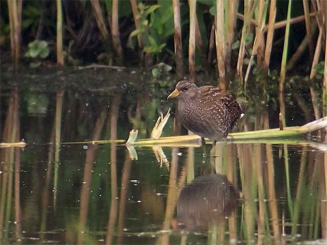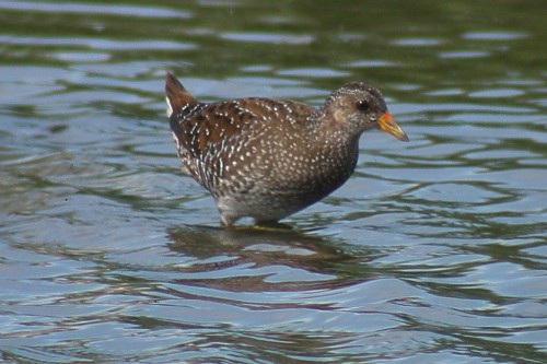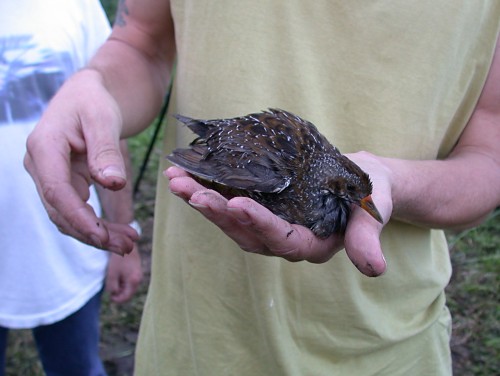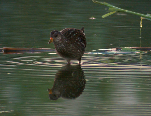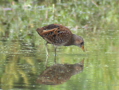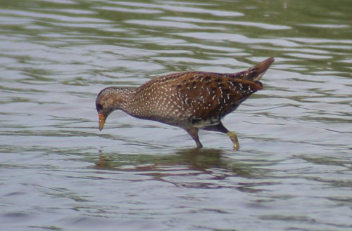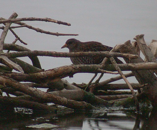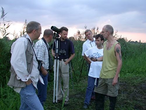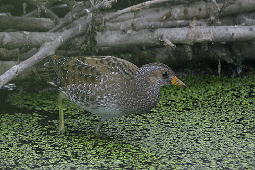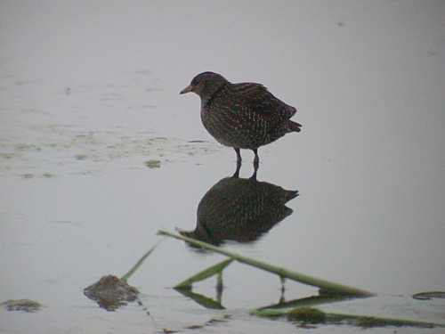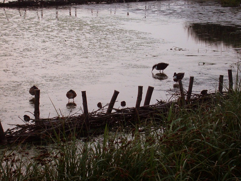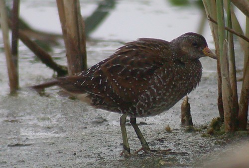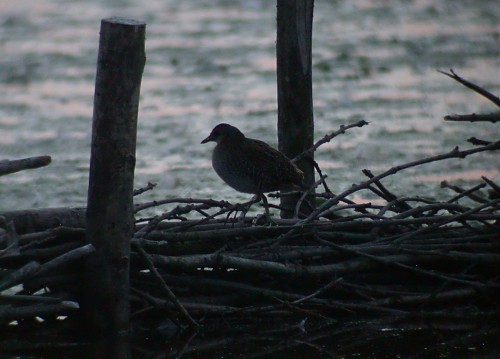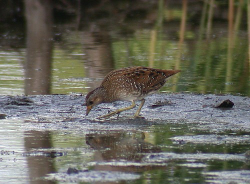 | Porseleinhoen, augustus 2004In augustus 2004 waren voor de uitkijktoren op de Kniplaan porseleinhoenders zichtbaar. Ze kwamen vaak uit de dekking en lieten zich op het open slik goed zien. Dit was het een herhaling van het tafereel in 2002. In dat jaar werd vanaf 22-7-2002 een porseleinhoen gezien in de hoek Kniplaan/fietspad. Vanaf 31-7-2002 werden regelmatig twee vogels gezien, en zaten ze recht voor de uitkijktoren. De laatste waarneming was op 18-8-2002. Dit jaar werd op 6-8-2004 op vrijwel dezelfde plek als in 2002 een juveniele porseleinhoen ontdekt. Op 9-8-2004 werden er vier gezien, en op 10-8-2004 waren 's avonds 5 porseleinhoenders aanwezig, die na zonsondergang op en in de takkenbossen gingen foerageren. Regelmatig waren ze samen met een juveniele waterral te zien. Ook op 17-8-2004 zijn nog 5 vogels gezien. Na 18-8-2004 zijn maximaal 2 vogels tegelijk gezien. Op 17-8-2004 bleek een van de porseleinhoenders ziek te zijn. Een van de aanwezige vogelaars heeft de vogel meegenomen naar een vogelopvang. De vogel was algeheel verzwakt, maar had geen verlammingsverschijnselen. De vogel kon ook de poten nog goed bewegen, waarmee het niet erg waarschijnlijk is dat het om botulisme ging. Op 18-8-2004 bleek dat fotografen de plek hadden betreden waar de porseleinhoenders rondlopen. Ze hadden vegetatie verwijderd - waaronder een vrij dichte struik waar de vogels bij voorkeur op en in foerageerden en ook op sliepen - en ze hadden meelwormen gestrooid. Ook op 22-8-2004 zat een fotograaf op het slik. De tweede helft van augustus viel heel veel regen. Het peil in de Vogelplas steeg vrij snel, van -3.76 m NAP begin augustus tot -3.62 m NAP eind augustus. De plek werd steeds minder geschikt voor de vogels. De laatste waarneming was op 24-8-2004. Hieronder enkele foto's van de porseleinhoenders. Zie ook de foto's in het vogeldagboek van Adri de Groot. 10-8-2004