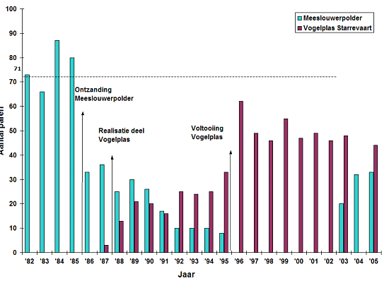verdween weer als broedvogel, hetgeen vermoedelijk met de late strenge vorst van 2005 te maken heeft (in gehele Haagse regio beduidend minder waarnemingen dan vorig jaar). Een groot deel van het gebied was dit voorjaar niet vrij toegankelijk vanwege gevaar van instortende oevers. Desondanks werd het gebied toch vrij intensief bewandeld, met name met honden. De vaarintensiteit neemt toe. Met name de nabijheid van de uitbreidingsgebieden Starrenburg I en II en de toenemende pleziervaart betekenen een bedreiging voor het gebied. Verdere ontsluiting van dit wandel- en vaargebied moet dan ook voorkomen worden. Bij eventuele herinrichting van de Vlietlanden moet de bestaande zonering strikt worden gehanteerd. Vaste schaarse broedvogelsFiguur 1 geeft de ontwikkeling weer van het totaal aantal paren vaste schaarse broedvogels voor de Meeslouwerpolder en de Vogelplas Starrevaart. De vaste schaarse broedvogels zijn gedefinieerd als de soorten die voor 1985 in de Meeslouwerpolder jaarlijks of vrijwel jaarlijks tot broeden kwamen, en die in Zuid- en Noord-Holland tot de vrij schaarse (minder dan 1.000 broedparen) tot zeer schaarse (minder dan 10 broedparen) broedvogels behoren (zie ook notitie Bancken). Deze vaste schaarse broedvogels zijn Dodaars, Roerdomp, Krakeend, Zomertaling, Wintertaling, Tafeleend, Bruine Kiekendief, Torenvalk, Waterral, Porseleinhoen, Engelse Gele Kwikstaart, Sprinkhaanzanger, Snor, Grote Karekiet, Braamsluiper en Baardmannetje, 16 soorten in totaal. De Vogelplas Starrevaart is aangelegd voor behoud van de riet- en moerasvogels. Onderstaande figuur is derhalve betrokken op genoemde soorten, met uitzondering van Torenvalk, Engelse Gele Kwikstaart en Braamsluiper. In de figuur is met verticale lijnen het tijdstip gemarkeerd waarop de Meeslouwerpolder onder water is gezet en het tijdstip waarop de Vogelplas is voltooid. Aangegeven is de gemiddelde stand van de vaste schaarse broedvogels van de Meeslouwerpolder in de jaren voor het onder water zetten van het gebied (1981 t/m 1983), te weten 71 paren. Deze stand vormt de norm voor de Vogelplas Starrevaart. De stand van de vaste schaarse broedvogels veranderde weinig. Het ging in 2005 om 6 soorten. Ten opzichte van 2003 verdwenen Dodaars en Waterral, en verscheen Torenvalk en Snor. Het aantal broedparen (44, norm is 71) bleef vrijwel gelijk. Het aantal paren wordt vooral door de stand van de Krakeend en Tafeleend bepaald (37 van de 44 paren). Vooral soorten van grotere overjarige rietvelden, zoals Roerdomp, Bruine Kiekendief, Snor en Grote Karekiet, blijven achter of ontbreken. Het achterwege blijven van de ontwikkeling van nat riet is nog altijd zorgelijk. Toename van nat riet is een voorwaarde om de doelstelling ten aanzien van de vaste schaarse broedvogels te halen. Na het broedseizoen van 2005 is een poging gedaan om deze ontwikkeling te versnellen. Aan de Kniplaanzijde is het uitbaggeren van de ringsloot gecombineerd met het aanleggen van een baggeropsluiting. De verwachting is dat het riet hier de kans krijgt om vanuit de wat hoger gelegen baggeropsluiting de plas in te groeien. Bij succes kan hetzelfde ook aan de zuidelijke dijk worden gedaan waar nat riet momenteel in het geheel ontbreekt. |