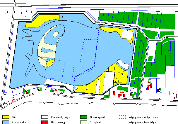 Broedvogels in de Vogelplas Starrevaart in 199628 december 1996 InleidingDit is het negende verslag over de broedvogelinventarisaties in de Vogelplas Starrevaart. In 1995 is de aanleg van de Vogelplas Starrevaart voltooid. De broedvogelinventarisatie van 1996 is de eerste na de voltooiing van het gebied. De aantallen broedvogels in dat jaar vormen een eerste indicatie voor het slagen van het doel van de aanleg. In 1996 is de Meeslouwerpolder niet langer geteld op broedvogels. Daarmee is een eind gekomen aan een lange reeks van inventarisaties, vanaf 1970 tot en met 1995. Na de onderwaterzetting in 1985 is de achteruitgang van de broedvogels nauwgezet in kaart gebracht, eerst door Jaap Hooijmans, later ook door Wim Hooijmans. Om diverse redenen is de reeks in 1996 niet langer voortgezet. De motivatie om in een steeds verder verarmend gebied te blijven tellen neemt af. De noodzaak om over recente cijfers te beschikken is met de voltooiing van de Vogelplas ook minder. De verarming van de Meeslouwerpolder is niet langer een argument in de discussie over de aanleg van de Vogelplas Starrevaart als vervangend gebied. Net als in voorgaande jaren is de Vogelplas Starrevaart in 1996 op broedvogels ge?ventariseerd volgens de BMP-methode van het SOVON, een soort territoriumkartering. De tellingen zijn door Sjaak Schilperoort verricht. Naast de Vogelplas Starrevaart zelf wordt ook de randbebouwing langs de Vliet en de bosaanplant van Staatsbosbeheer (SBB) ten zuiden van de Vogelplas geteld (zie figuur 1). Om de vogelontwikkelingen goed te kunnen duiden is eerst een beschrijving van het gebied opgenomen zoals dat na de voltooiing van de aanleg is opgeleverd. Hierna volgt de beschrijving van het broedvogelbestand en van de belangrijkste ontwikkelingen daarin. Het zonder meer toepassen van de gehanteerde telmethode lijkt voor sommige soorten tot verkeerde interpretaties te leiden. In een apart hoofdstuk wordt hieraan voor enkele soorten een discussie gewijd. Tot slot volgt zoals gebruikelijk de ontwikkeling van de stand aan `vaste schaarse broedvogels', de graadmeter van het welslagen van de vervanging van de Meeslouwerpolder door de Vogelplas Starrevaart. GebiedsbeschrijvingIn 1995 is met de voltooiing van de Vogelplas Starrevaart begonnen. Begin 1996 zijn de laatste werkzaamheden afgerond. Het resultaat was dat de Vogelplas Starrevaart met een factor 3 ࠴ in oppervlak toenam, van 17 naar ca. 65 ha. Dit is ten koste gegaan van het oppervlak aan grasland. Deze verandering weerspiegelt zich in de broedvogelstand. In figuur 1 is een kaartje van het gebied weergegeven zoals het er in het voorjaar van 1996 bijlag.