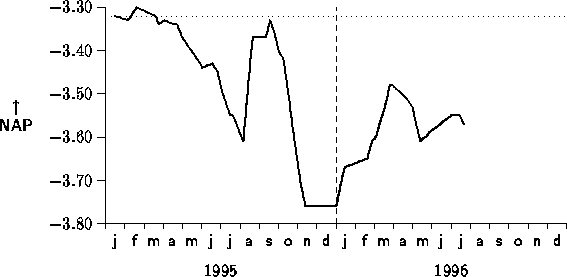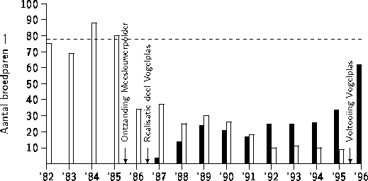 Wat voor de kleine karekiet geldt, gaat in nog sterkere mate op voor de rietzanger. Ondanks de afname aan rietoppervlak neemt de rietzanger nog steeds in aantal toe, van 27 naar 32 territoria. Het aantal territoria in het rietveld aan de Vliet-zijde nam toe van 12 naar 26 territoria, meer dan een verdubbeling. Deze vooruitgang staat in contrast met de landelijk geconstateerde achteruitgang van de soort. Ook in het rietveld was een spectaculaire vestiging: 2 snorren lieten zich het hele voorjaar goed horen en zien. Beide territoria bevonden zich aan de rand van het pitrusveld in de zuid-hoek van de plas. Voorkeur voor dergelijke vegetatie is bekend uit de literatuur[1]; ook in de Coto Do?na in Spanje broedt de soort in dergelijk terrein. Mogelijk dat de lage waterstand in 1996 het pitrusveld in de Vogelplas Starrevaart aantrekkelijk maakte voor de snor. De snor foerageert ook graag op de grond, en de vegetatie kwam door de lage waterstand net droog te staan. De roerdomp, die drie jaar achtereen in ditzelfde pitrusveld zijn territorium had, is in 1996 niet meer aangetroffen. In het rietveld waren verder 3 blauwborsten, 1 sprinkhaanrietzanger en 1 baardmannetje aanwezig. E?maal is ook de grote karekiet waargenomen, maar waarschijnlijk betrof dit doortrek. Het oppervlak aan grasland is vergeleken met voorgaande jaren fors afgenomen. Hier en daar resteren nog kleine percelen tussen de ringdijk van de Vogelplas en omringende wegen en bebouwing. Het is verrassend hoeveel weidevogels zich hier nog weten te handhaven. Dit geldt vooral voor de kievit, van 44 in 1994 naar 27 in 1996, en de scholekster, van 17 in 1994 naar 12 in 1996. De tureluur is zelfs toegenomen, maar die prefereert vooral de ondiepe delen van de Vogelplas zelf. Mogelijk dat bij de weidevogels plaatstrouw een rol speelt. Naast de Vogelplas zelf is, zoals in de inleiding vermeld, ook de randbebouwing en bosaanplant van SBB geteld. In de erfbeplanting langs de Vliet waren dit jaar de spotvogel en de zwarte roodstaart aanwezig. De ringmus is wederom niet aangetroffen. De huiszwaluw blijft op het lage peil van 7 nesten steken. In het SBB-bos was de sperwer weer als broedvogel present; er zijn twee jongen gezien. Dit jaar werd voor het eerst de ransuil in het SBB-terrein aangetroffen. Een paartje liet zich vanaf de toegangsweg uitgebreid bekijken. De stand van de fazant is fors toegenomen. De bijvoedering van afgelopen winter zal daar aan hebben bijgedragen. Alhoewel het inrichten van voerplaatsen niet de bedoeling is, had SBB vreemd genoeg voor die bijvoedering toestemming gegeven aan de WBE. De winterkoning heeft zoals verwacht een klap gekregen van de strenge winter. De stand valt terug van 17 naar 5 paar. Ook de roodborst was in 1995 zeldzaam, met slechts 1 (late) vestiging. Opvallend is de terugval van de tjiftjaf, van 10 naar 4 paar. Als we tenslotte het resultaat zien van het broedseizoen van 1996, zoals dat is samengevat in tabel 1, zien we dat zowel het aantal soorten als het totaal aantal broedvogels fors is gestegen. De voornaamste oorzaak van dat laatste ligt in de enorme toename van soorten als kokmeeuw, visdief, kluut, kleine plevier en meerkoet, en de toename die alle eendesoorten te zien geven. TelmethodeVoor een aantal soorten lijkt de gehanteerde telmethode, de BMP-methode van het SOVON, niet tot juiste resultaten te leiden. De BMP-methode richt zich vooral op homogene gebieden. Een gebied als de Vogelplas Starrevaart, met biotopen die schaars zijn in de wijde omgeving, kan een grote aantrekkingskracht uitoefenen op niet-broedvogels. Hieronder volgt een discussie voor die soorten waarvan het broeden niet met zekerheid kon worden vastgesteld. Bij de BMP-methode worden overzomeraars meegeteld als broedvogels, omdat je doorgaans geen verschil tussen de twee kan maken. Dit lijkt bij de Vogelplas tot een te hoge schatting te leiden voor soorten als bergeend (4), tafeleend (31), kuifeend (39) en zwartkopmeeuw (2). De waargenomen aantallen echter zijn voor deze soorten gehandhaafd. Zekere gevallen van overzomering werden geconstateerd bij de lepelaar, krakeend, kleine mantelmeeuw en stormmeeuw. Deze gevallen zijn niet opgenomen in de broedvogeltabel, hoewel dat volgens de BMP-criteria en -normen wel mogelijk was geweest. Mogelijk hebben ook de smient (4) en bontbekplevier (1) slechts overzomerd. Ze zijn echter, in overeenstemming met de BMP-methode gehandhaafd in tabel 1. Tenslotte, het gebied kan door zijn voedselrijkdom als foerageergebied fungeren voor soorten die elders broeden. Dit was zeker het geval voor bruine kiekendief, buizerd en roerdomp. De bruine kiekendief heeft gebroed in de Meeslouwerpolder, en daar 3 jongen grootgebracht. Het paartje buizerds is vrijwel zeker afkomstig van landgoed Duivenvoorde. De roerdomp heeft mogelijk gebroed in de Meeslouwerpolder. In de Vogelplas werd ?nmaal een roerdomp opgejaagd, die naar het grote rietveld aldaar vloog. De concept-versie van dit rapport is naar het SOVON gestuurd. Arend Jan van Dijk, landelijk co?dinator van het BMP-onderzoek, meldde dat de interpretatie van de gegevens in overeenstemming met de richtlijnen van het SOVON BMP-onderzoek is. Vaste schaarse broedvogelsFiguur 3 geeft een grafiek met de ontwikkeling van het totaal aantal paren vaste schaarse broedvogels voor de Meeslouwerpolder en de Vogelplas Starrevaart in de loop van de tijd. De vaste schaarse broedvogels zijn gedefini?rd als de soorten die voor 1985 in de Meeslouwerpolder jaarlijks of vrijwel jaarlijks tot broeden kwamen, en die in Zuid- en Noord-Holland tot de vrij schaarse (minder dan 1.000 broedparen) tot zeer schaarse (minder dan 10 broedparen) broedvogels behoren. Deze vaste schaarse broedvogels zijn dodaars, roerdomp, krakeend, zomertaling, wintertaling, tafeleend, bruine kiekendief, torenvalk, waterral, porseleinhoen, engelse gele kwikstaart, sprinkhaanzanger, snor, grote karekiet, braamsluiper en baardmannetje. In figuur 3 is met vertikale lijnen het tijdstip gemarkeerd waarop de Meeslouwer