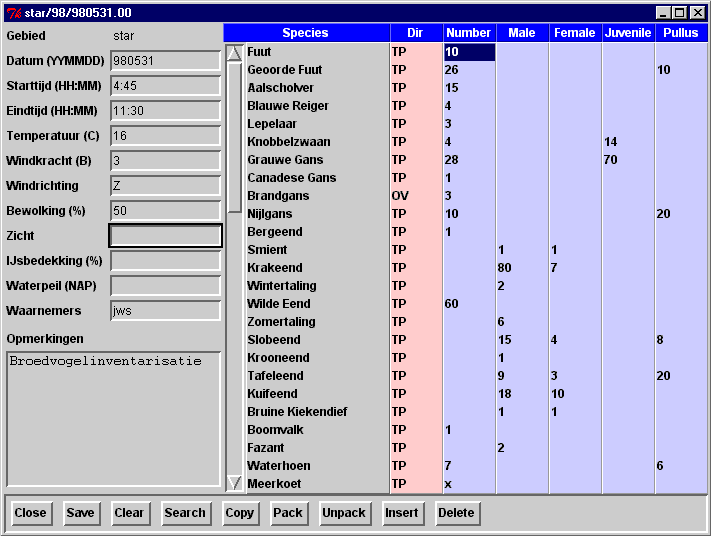 WaarnemingsbestandSinds 1990 heb ik voor de VWG Vlietland een zelf-geschreven programma in gebruik voor verwerking van tellijsten van mezelf en van anderen. Begonnen in perl4/cursus op een Atari ST, herschreven naar perl5/Tk op Unix, en daarna zonder aanpassingen omgezet naar Windows95. Met het programma kun je de tellingen in verschillende gebieden bijhouden. Per gebied stel je van te voren vast hoe je een telling wil beschrijven. Je legt de parameters vast (zoals begin/eindtijd) en de toegestane waarden hiervan. Per gebied stel je ook vast welke vogels op de standaard lijst komen. Deze lijst krijg je bij iedere nieuw in te vullen lijst te zien. Vogels die hier niet op voorkomen kun je toevoegen via een lijst van ruim 2000 vogelnamen (alle vogels van het holearctische gebied). Tellijsten worden per gebied en per jaar opgeslagen in een directory als ascii-tekst. Via aparte scripts haal ik hier zaken uit als maandmaxima, grote aantallen en andere statistiek. Het front-end ziet er (na invullen van een tellijst) als hieronder uit. Door toevoegen van interface-eigenschappen (meest recentelijk: incremental search in de soortlijst bij intypen van letters, ?a emacs) is het mogelijk om vrij snel een telling in te voeren (en dit is een voorwaarde om het vol te houden).