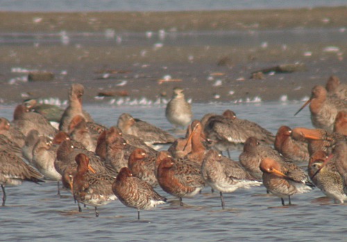 IJslandse Grutto's met rechts twee geringde vogels, OW/OW[X] en WO/YG, 10-4-2005