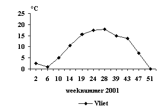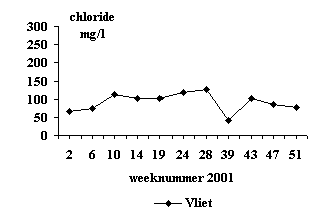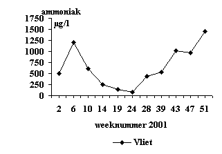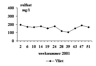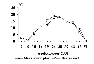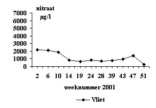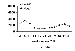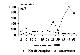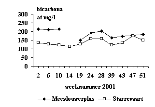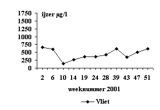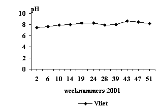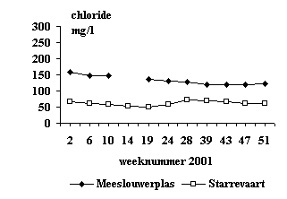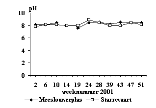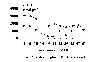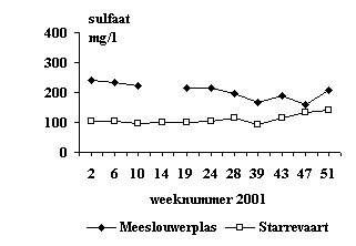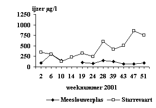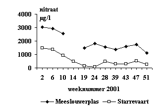 Waterkwaliteit Vogelplas Starrevaart, Meeslouwerplas en Vliet in 20018 maart 2002 Samenvatting van de meetgegevens van de waterkwaliteit van de Vogelplas Starrevaart, de Meeslouwerplas en de Vliet in 2001. Ilse de Graaf Bierbrauwer-W?tz. Grafieken: Marcel Noordervliet. Zie ook de toelichting. InleidingAlgemeen Bijzonderheden Vanaf september 2001 is het waterpeil van Starrevaart verlaagd voor werkzaamheden bij het aanleggen van een eiland. Vanaf half oktober 2001 tot half januari 2002 was er zeer weinig water in de plas. Eind januari 2002 was het waterpeil weer normaal. Er is geen water ingelaten uit de Meeslouwerplas of de Vliet. Door de lage waterstand komt er aan de noordkant en aan de zuidkant kwelwater boven, waardoor het fosfaat- en het ijzergehalte op deze plekken hoger is dan in de rest van de plas. StarrevaartTemperatuur van het water was in de zomer van 2001 gemiddeld lager dan in de zomer van 2000. Dit is gunstig in verband met botulisme. Zuurgraad. De pH van het water is alle jaren ongeveer 8. Alleen in de zomer loopt de pH door fotosynthese van planten en algen op tot 8,5 - 9. Dit zijn normale waarden voor Nederlandse meren en plassen. Bicarbonaatgehalte is het hele jaar ongeveer 125mgHCO3/l. In de zomer door fotosynthese oplopend tot 160 mgHCO3/l. Chloridegehalte is na het vergroten van de plas in 1995 opgelopen van ongeveer 100mgCl/l tot 200mgCl/l. Vanaf 1998 daalde het chloridegehalte weer tot ongeveer 100mgCl/l in 2000. In 2001 is het chloridegehalte gemiddeld 80mgCl/l. Sulfaatgehalte is ook weer op het niveau van voor de vergroting van de plas: ongeveer 100mgSO4/l. Alleen tijdens de periode van de verlaagde waterstand liep dit op tot 140mgSO4/l. Mogelijk door kwel. Ammoniakgehalte. In de zomermaanden is het ammoniakgehalte lager dan in de winter. Vogels zijn verantwoordelijk voor de hogere NH4-concentratie in de winter. Algen en planten nemen in de groeiperiode stikstof op en denitrificatie door bacteri? zorgt ervoor dat er stikstof uit het water verdwijnt. In de zomer is er 125 ?gN/l (als ammoniak), in de wintermaanden oktober, november en december oplopend van 450 tot 1000?gN/l (als ammoniak). Nitraatgehalte is in de winter ook hoger dan in de zomer. 1400?gN/l (als nitraat) in januari en februari, 1000?gN/l (als nitraat) in maart, daarna dalend naar ongeveer 300?gN/l (als nitraat) in de zomermaanden. In mei en juni liggen de concentraties lager door opname van stikstof door planten- en algengroei. Fosfaatgehalte is het hele jaar ongeveer 150?gP/l. In juli was er een piek van 470?gP/l, waarschijnlijk werd dit door kwelwater veroorzaakt. Tijdens de lage waterstand liep het fosfaatgehalte ook op. IJzergehalte volgt het fosfaatgehalte. In de winter ongeveer 300?gFe/l, met uitzondering van dit jaar. Door kwel: 750?gFe/l. In juli piek van 600?gFe/l. VlietDe concentratie van de nutri?ten in de Vliet is het hele jaar hoger dan in de Vogelplas Starrevaart. Zuurgraad: de pH van de Vliet is tussen 7,5 en 8,6. Bicarbonaatgehalte is het hele jaar gemiddeld 215mgHCO3/l. Chloridegehalte is gemiddeld ? 100mgCl/l. Sulfaatgehalte is tussen 105 en 195 mgSO4/l Ammoniakgehalte: in de zomer 100 -500 ?gN/l. In de winter 1000-1400 ?gN/l. Nitraatgehalte is in de zomer ? 800?gN/l en in de winter tussen 1000 en 2100?gN/l. Fosfaatgehalte: ? 625?gP/l in de winter, ? 300?gP/l in het voorjaar en ? 825?gP/l in de zomer. IJzergehalte is in de zomermaanden ? 350?gFe/l en in de wintermaanden ? 600?gFe/l. MeeslouwerplasZuurgraad: de pH van de Meeslouwerplas is het hele jaar ? 8, alleen in de zomer oplopend naar pH 8,9. Bicarbonaatgehalte is gemiddeld 190mgHCO3/l. Er zijn kleine schommelingen. Het HCO3 gehalte is hoger dan in Starrevaart Chloridegehalte is, met kleine schommelingen, gemiddeld 130mgCl/l. Dit is hoger dan in Starrevaart. Sulfaatgehalte is gemiddeld 205mgSO4/l. Het gehalte is hoger dan in Starrevaart. Ammoniakgehalte is gemiddeld 50?gN/l. In mei en juni ? 130?gN/l. In de winter is het NH4 gehalte veel lager dan in Starrevaart. Nitraatgehalte: in de winter 1100-3000 ?gN/l, in de zomer ? 1500?gN/l. Dit is veel hoger dan in Starrevaart. Fosfaatgehalte is gemiddeld 150?gP/l, met kleine schommelingen. In de zomer is het gehalte lager dan in Starrevaart, in de winter hoger. IJzergehalte: tussen 70-150?gFe/l. Gemiddeld 125?g/l. Er was een piek van 300?gFe/l in februari 2001. GrafiekenTemperatuur